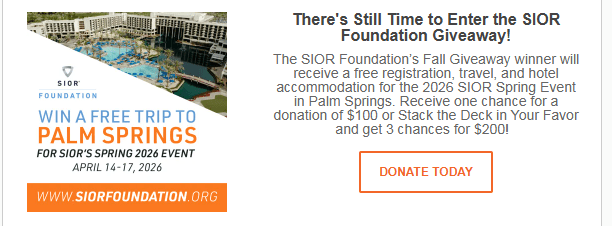 The SIOR Foundation’s Fall Giveaway winner will receive free registration, travel, and hotel accommodation for the 2026 SIOR Spring Event in Palm Springs! Receive one chance for a donation of $100 or Stack the Deck in Your Favor and get 3 chances for $200!